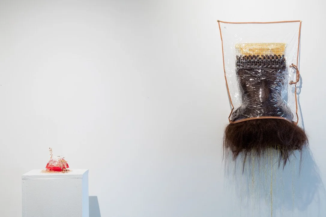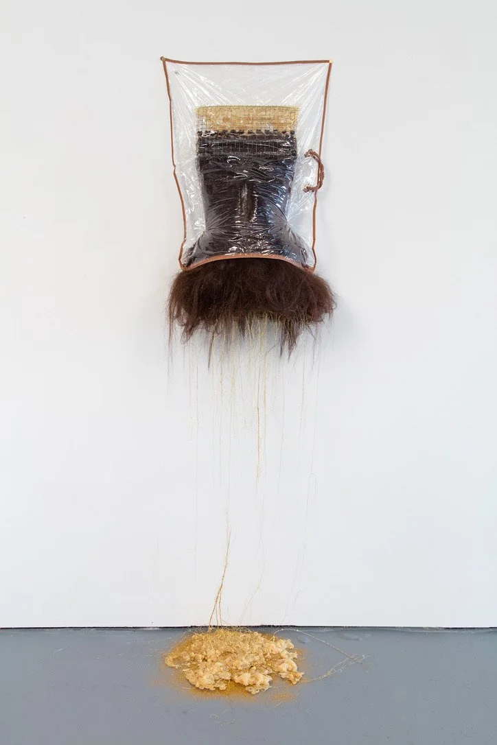 PEVA vinyl pillow bag, wire screen, synthetic hair, gorilla glue, gold thread, glitter