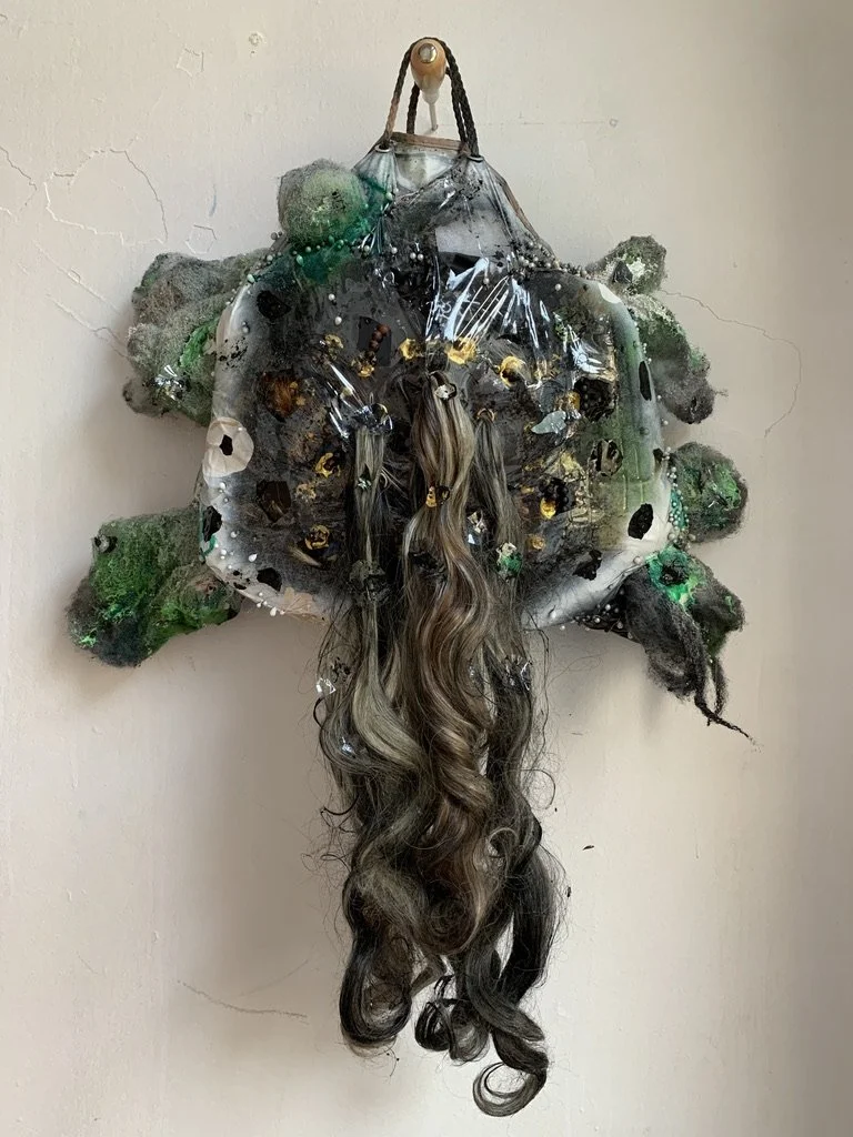 paper doily, beads, acrylic paint, resin, spray paint, fishing wire, synthetic hair, a pillow, PEVA vinyl zippered pillow case protector, pushpins