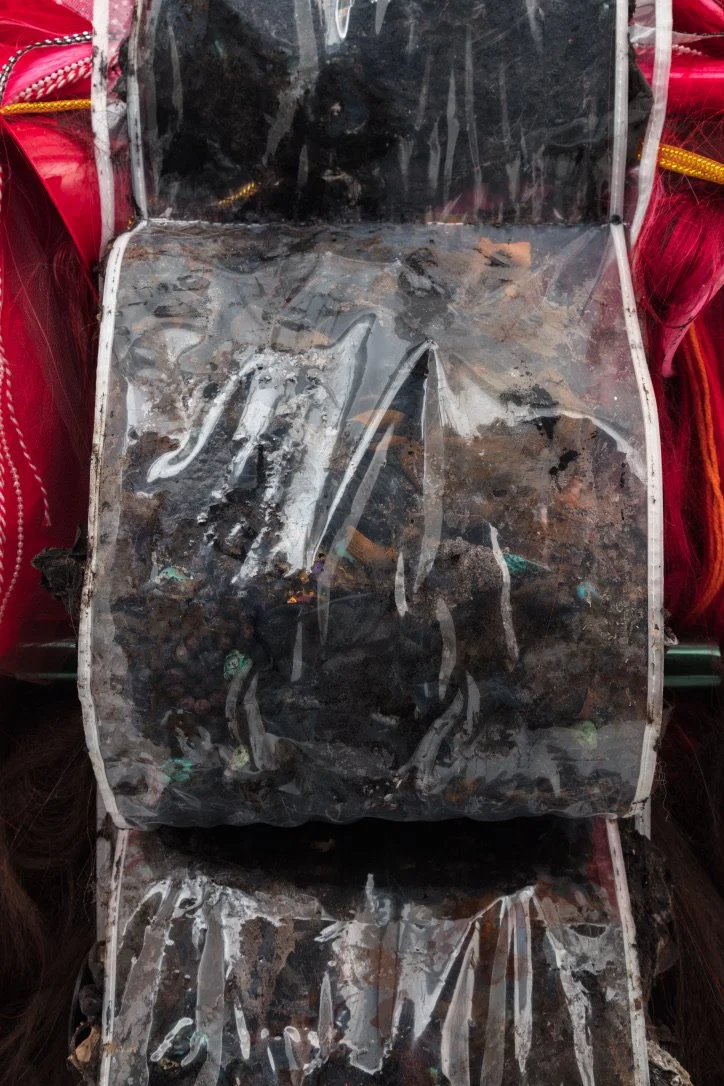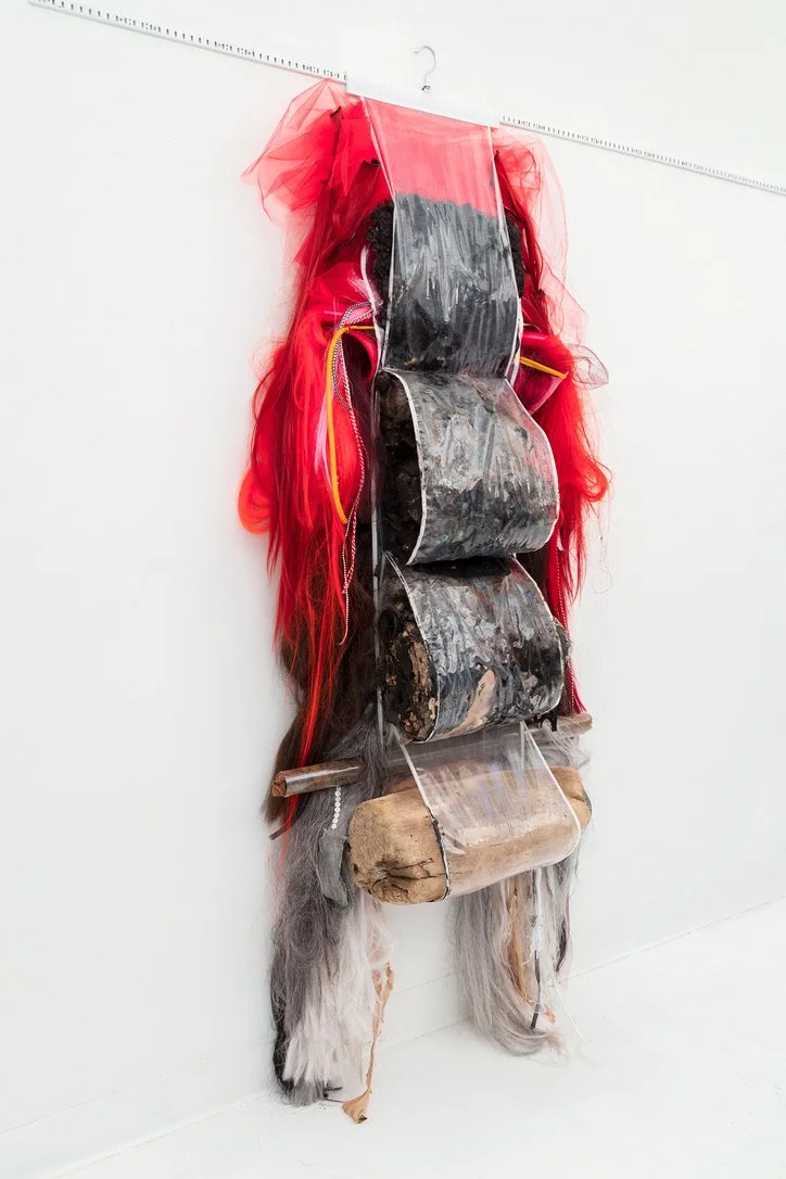 PEVA (vinyl) 8 pocket file, synthetic hair, ribbon, craft materials, plastic funnels, soil, steel wool, paper, driftwood, crystals, turquoise, synthetic hair, silicone, found synthetic and organic objects