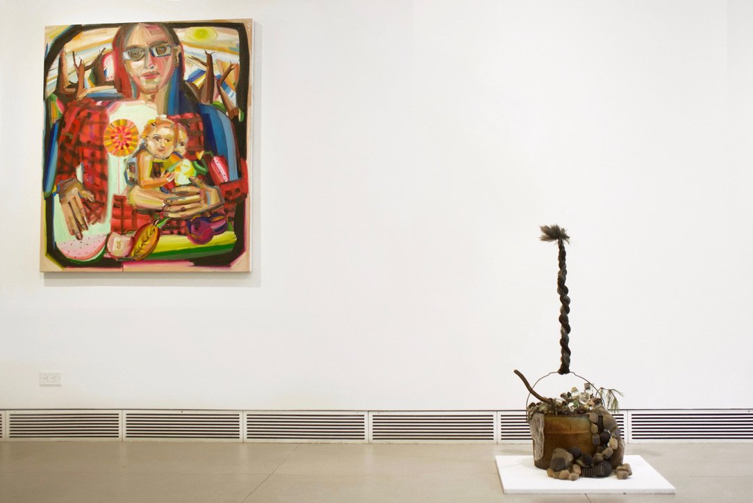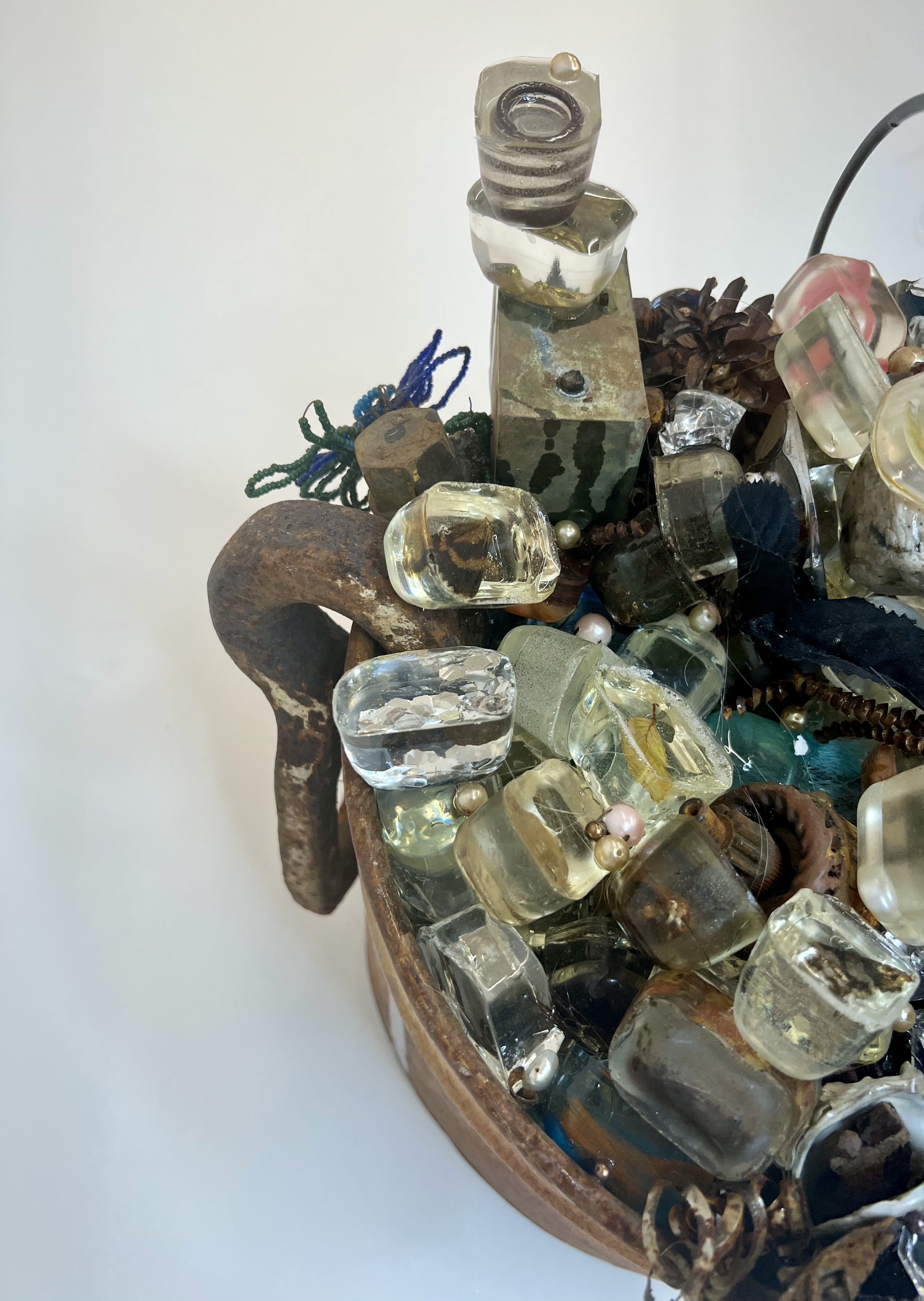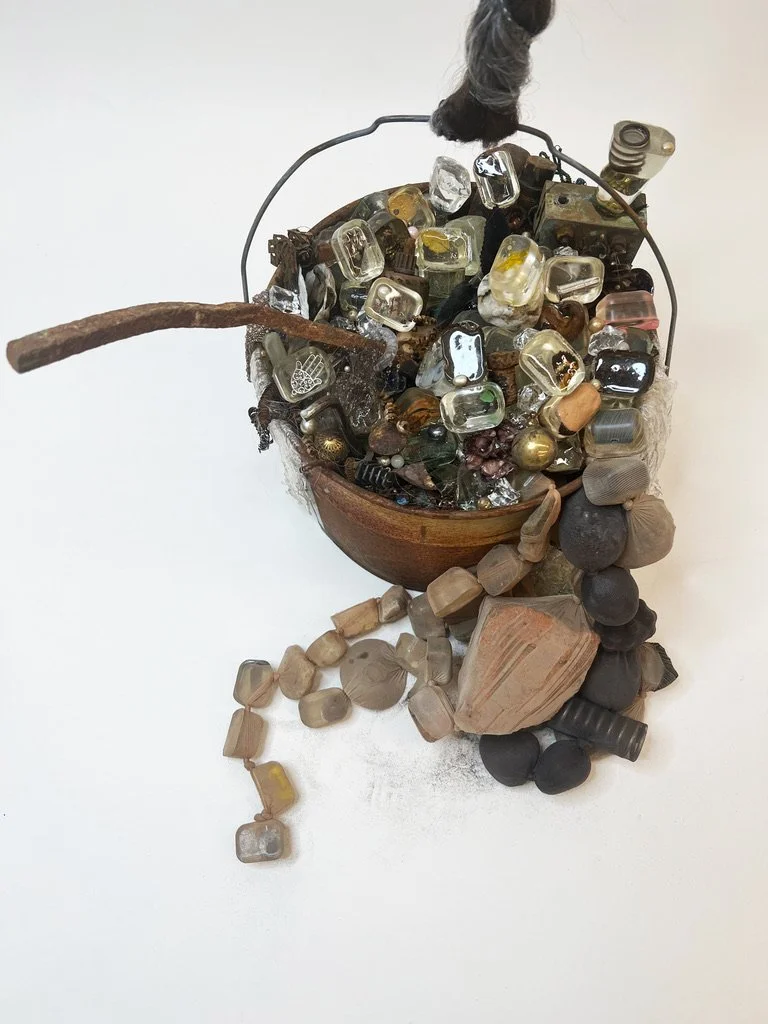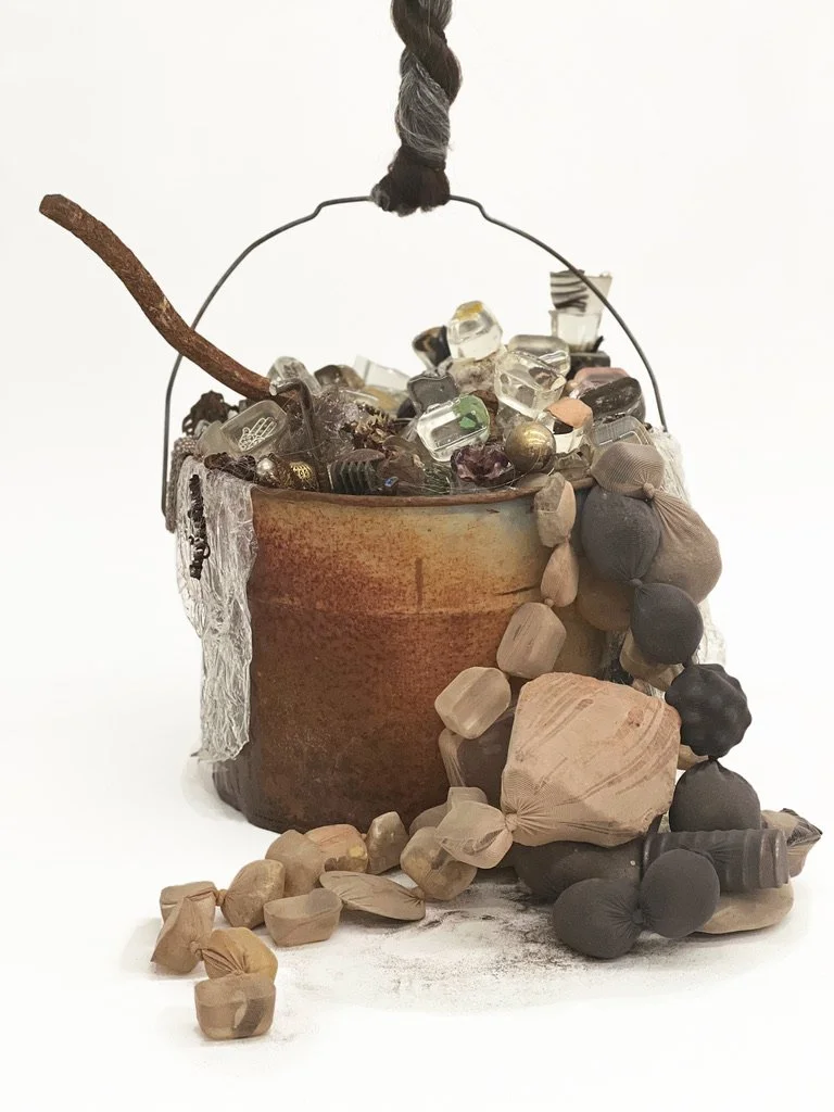 found bucket, stones, synthetic and organic found objects, hosiery, plastic wrap, synthetic hair, soil, resin