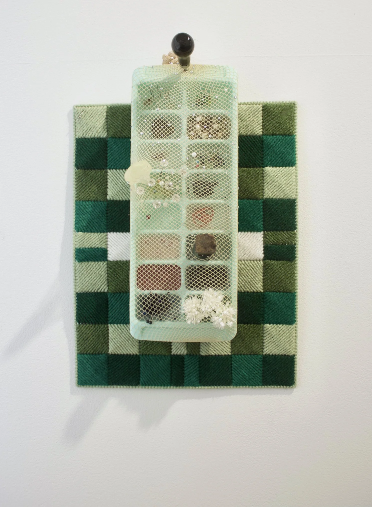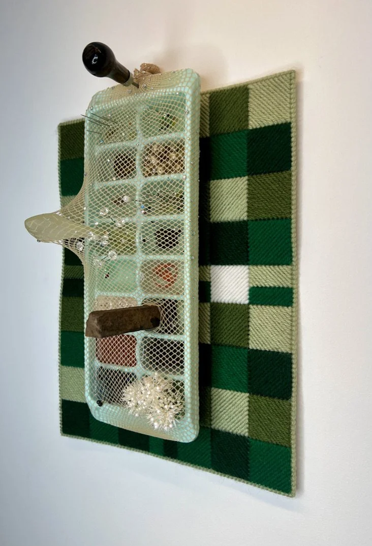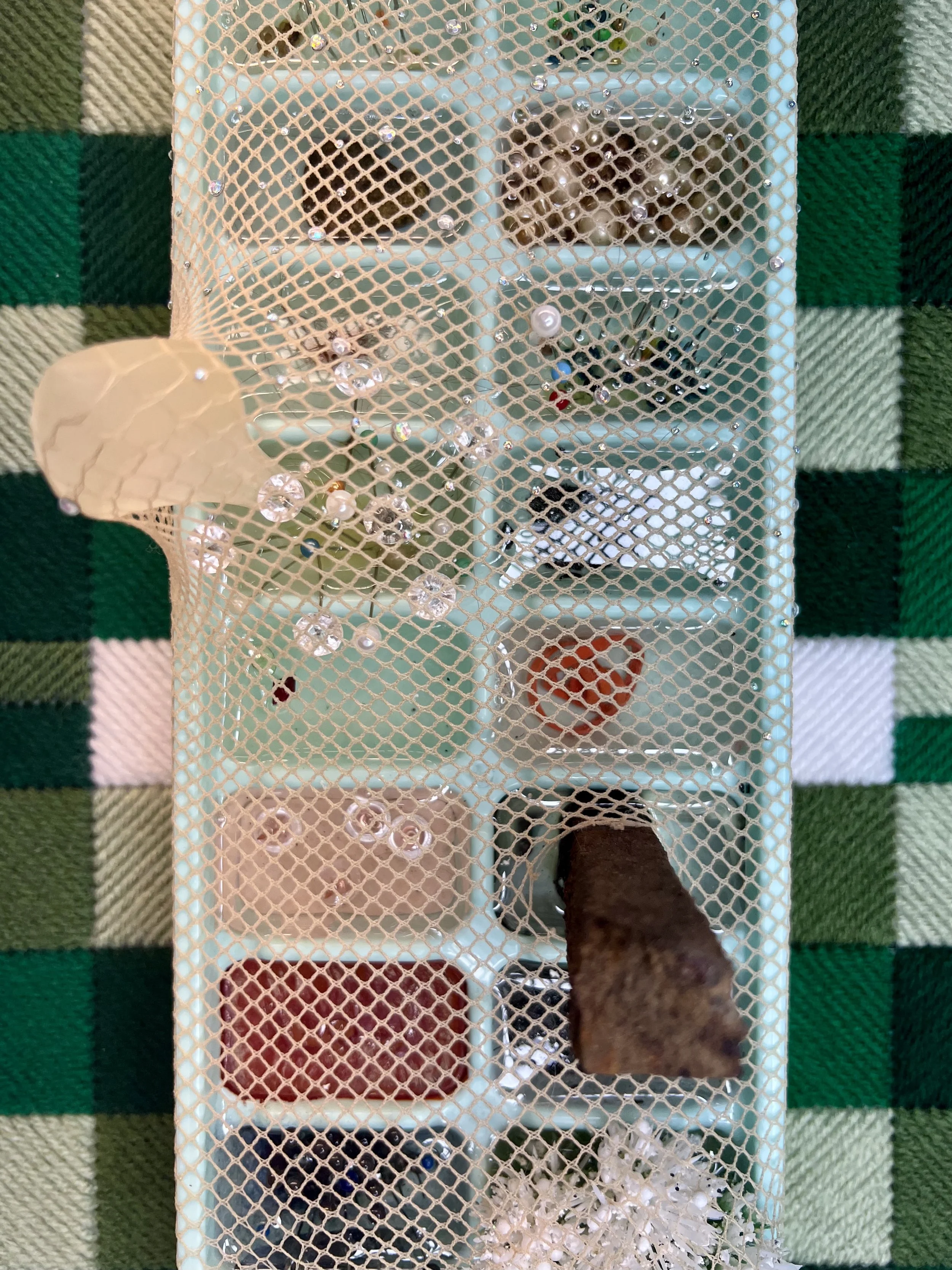 ice cube tray, resin, organic and synthetic found objects, decorative pins, needlepoint placemat, hosiery, ice pick