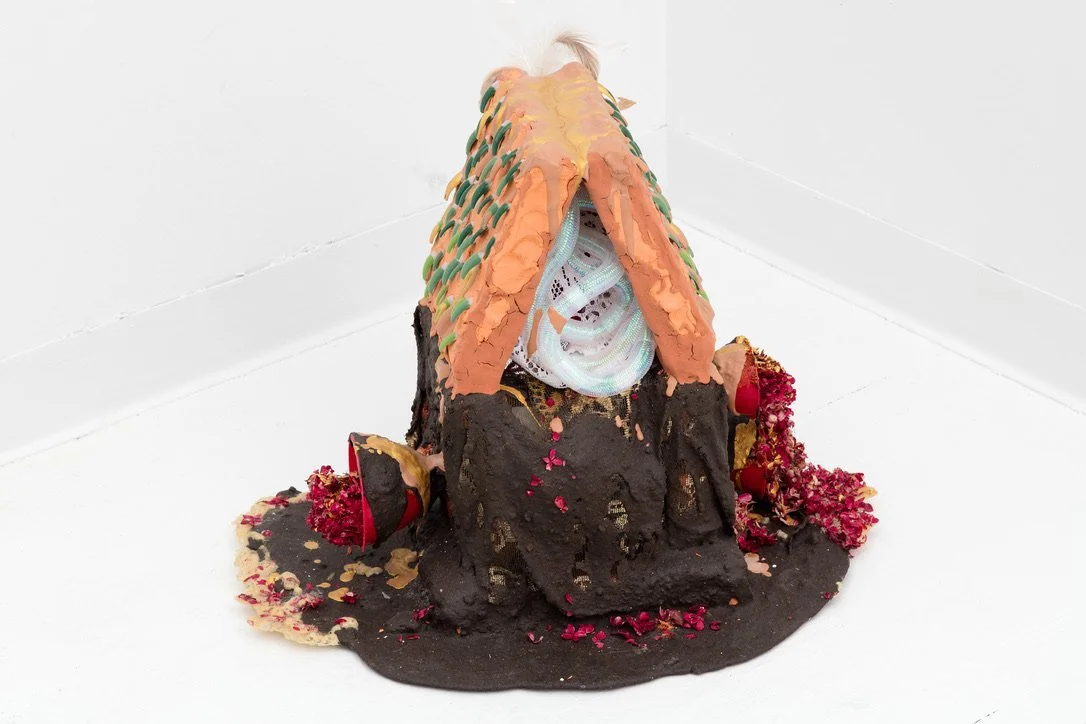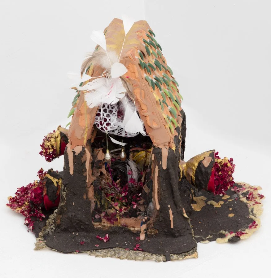 board, clay, organic and synthetic flora, paints, liquid latex, synthetic nails, synthetic hair, glues, lace, craft supplies, found objects