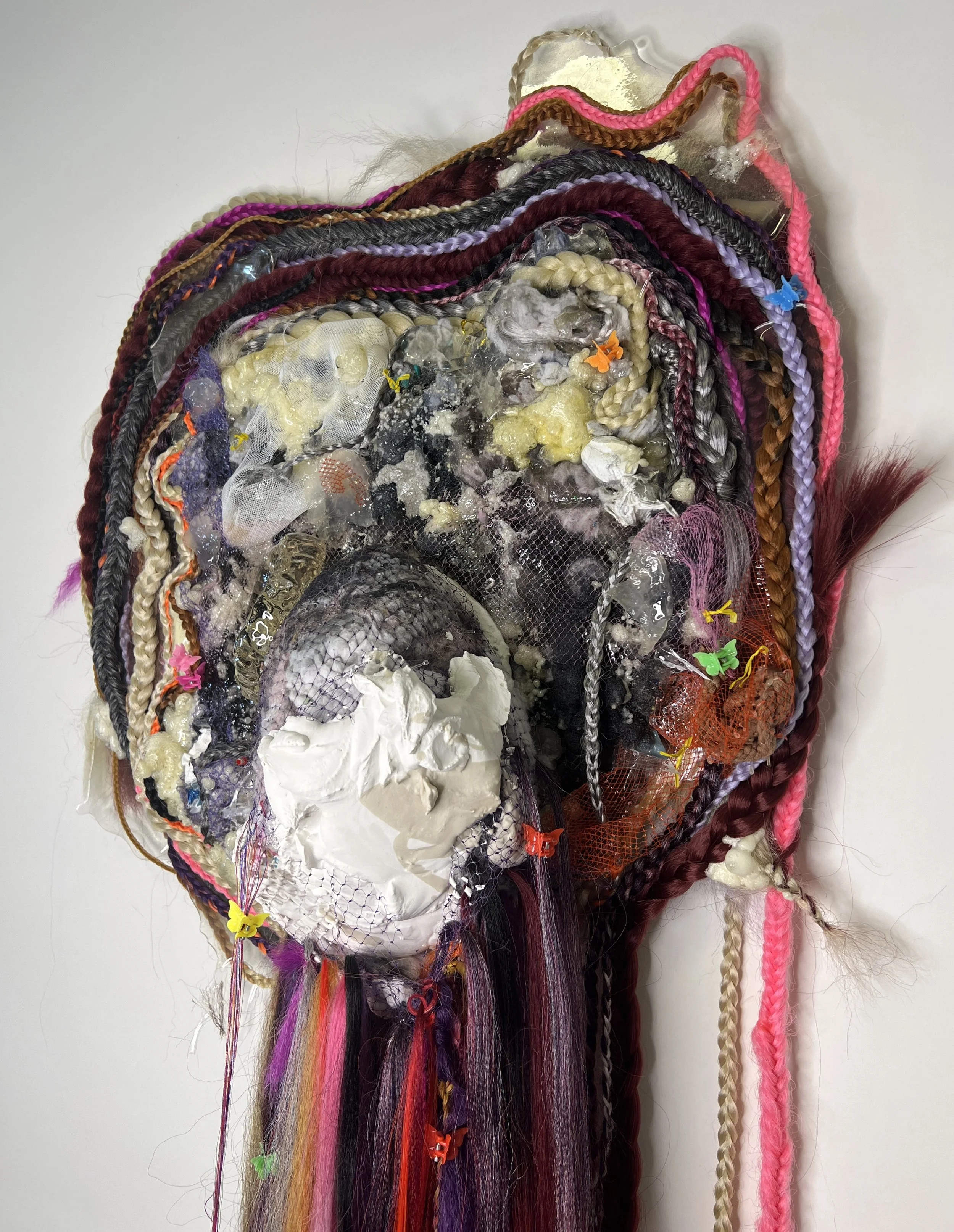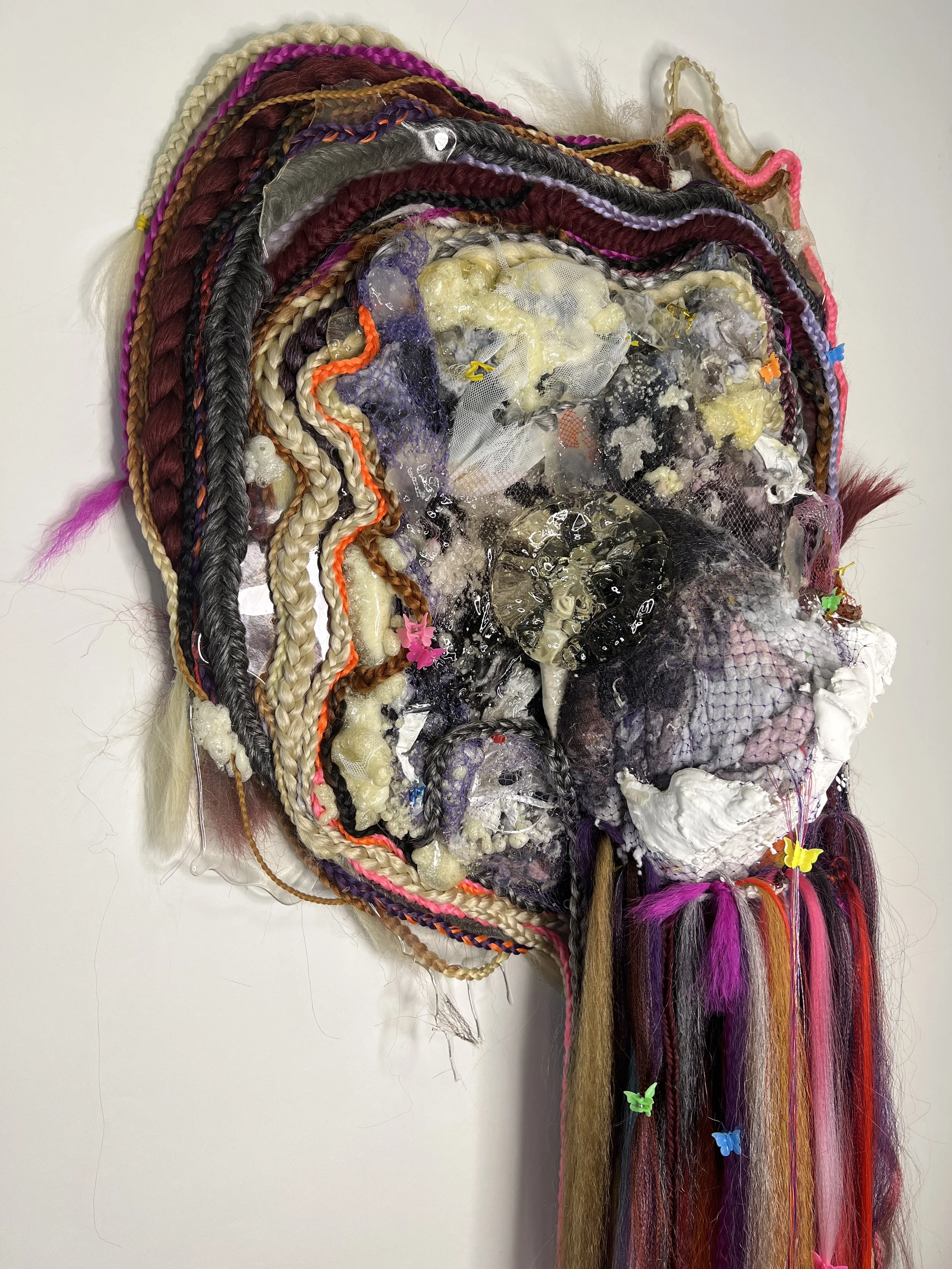 synthetic hair, dryer lint, resin, plaster, glue, mesh produce bags, detritus, thread, hair clips, board