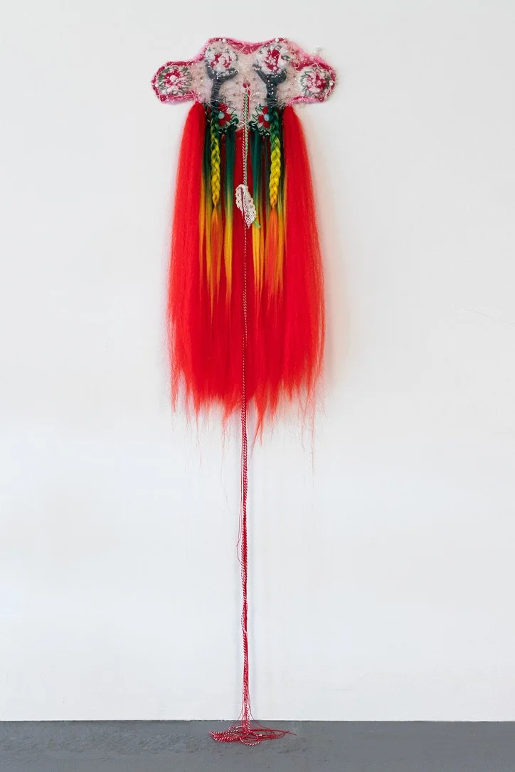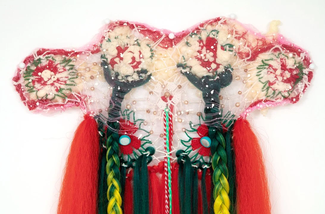 vintage crochet doily, gorilla glue, pearls, thread, synthetic hair, twine, buttons, fabric