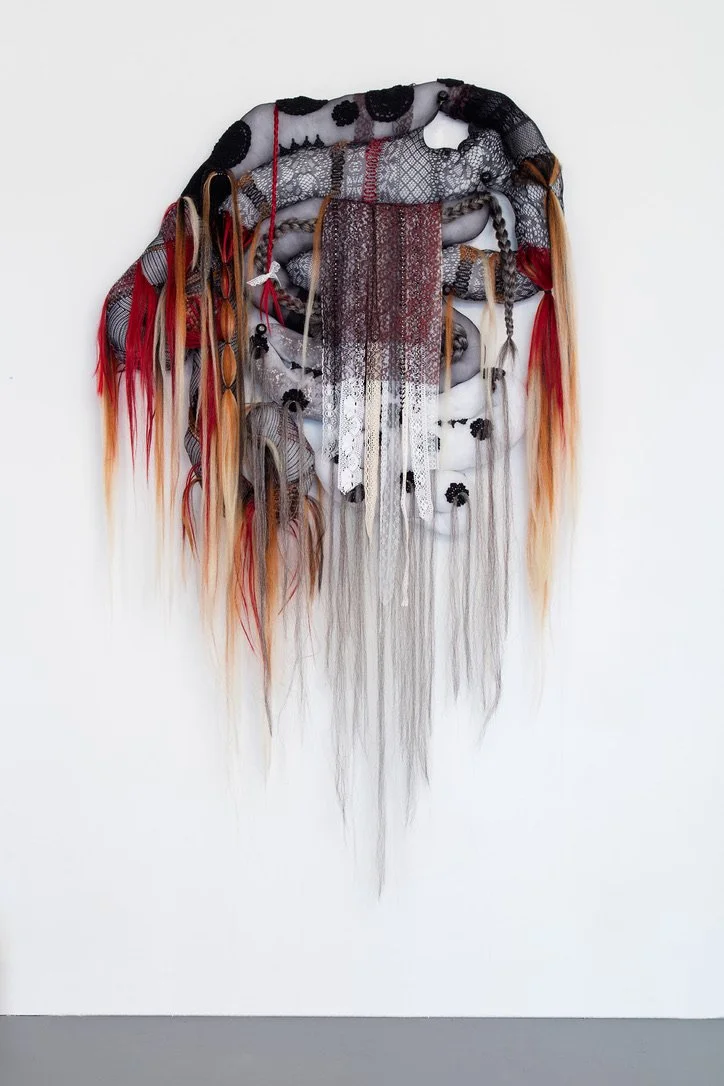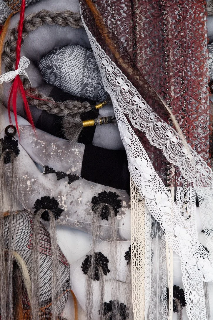 assorted hosiery, synthetic hair, poly-fil, soil, lace, lace ribbon, crochet decals, thread, rubber bands, beading