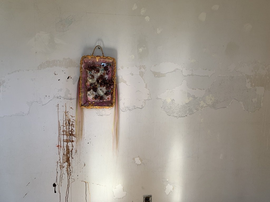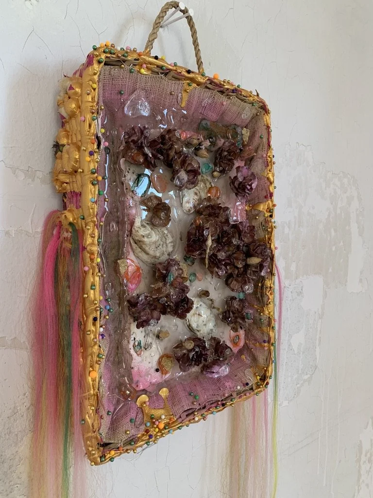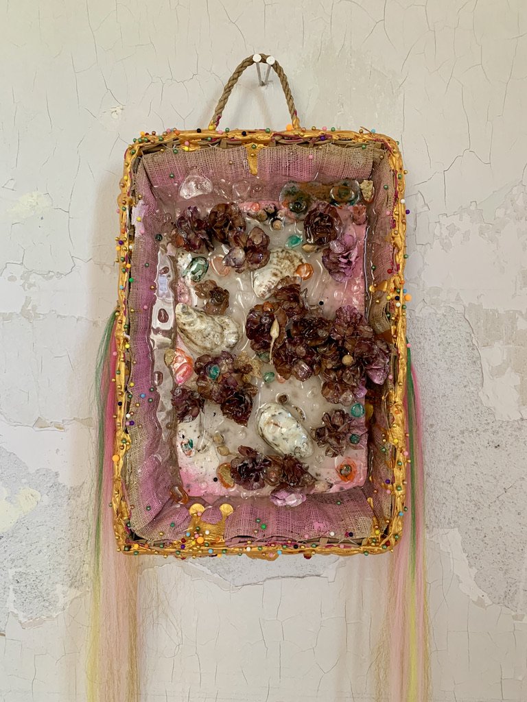 casserole basket, pushpins, synthetic hair, alginate, resin, carnations, oyster shells, acrylic paint