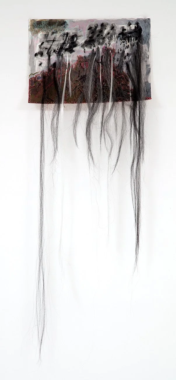 ink, paint, colored pencil, mesh produce bag, thread, synthetic hair