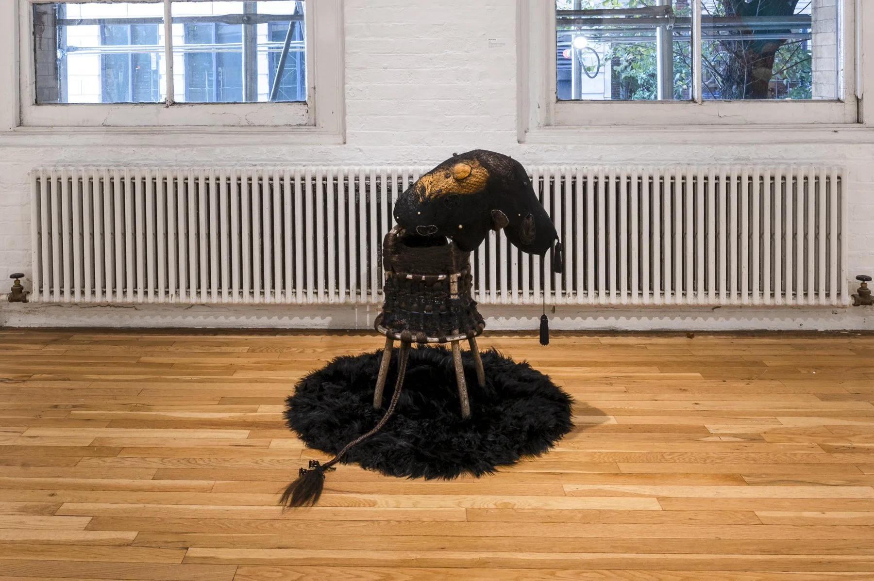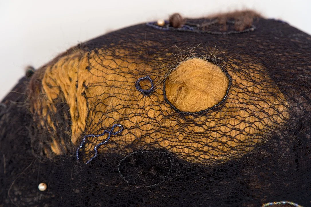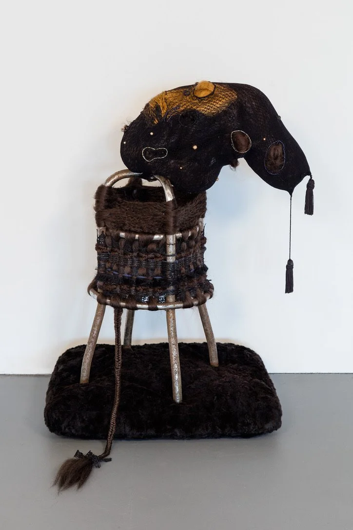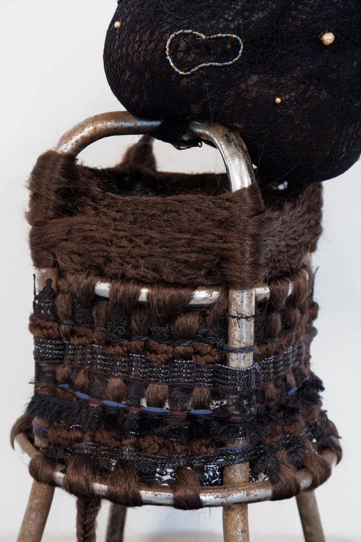 stool legs, synthetic hair, ribbon, lace, thread, found objects, fishnet hosiery, poly-fil, wire, beading, tassels