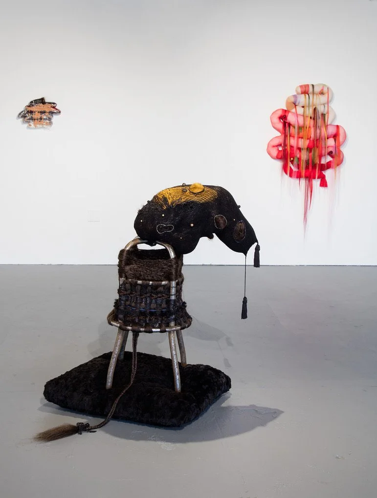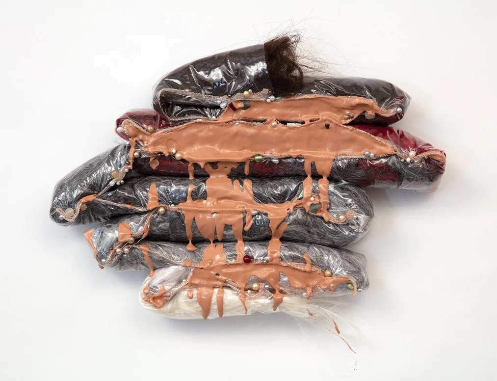 vinyl, thread, glue, synthetic hair, pearl head pins, beads, liquid latex